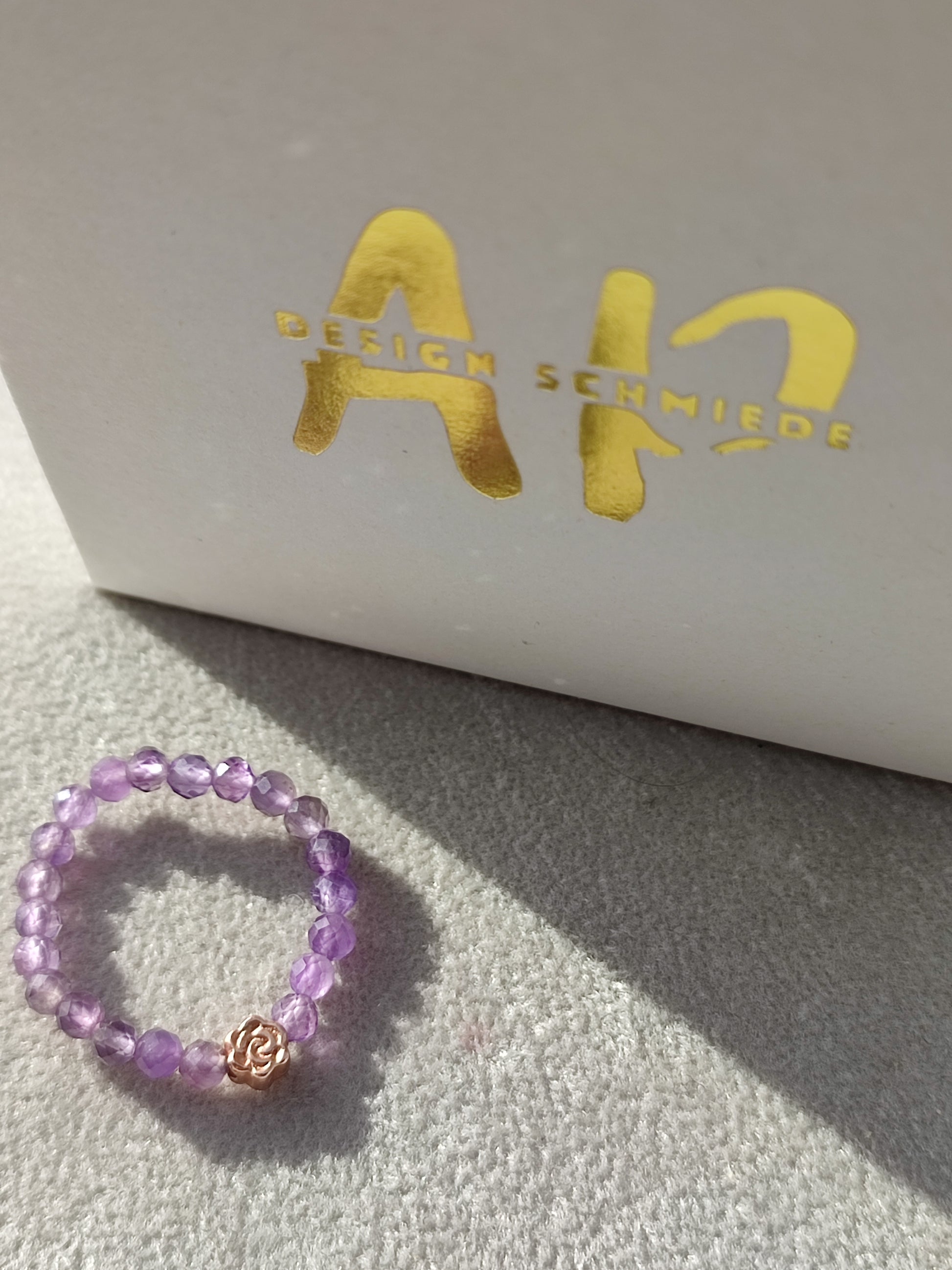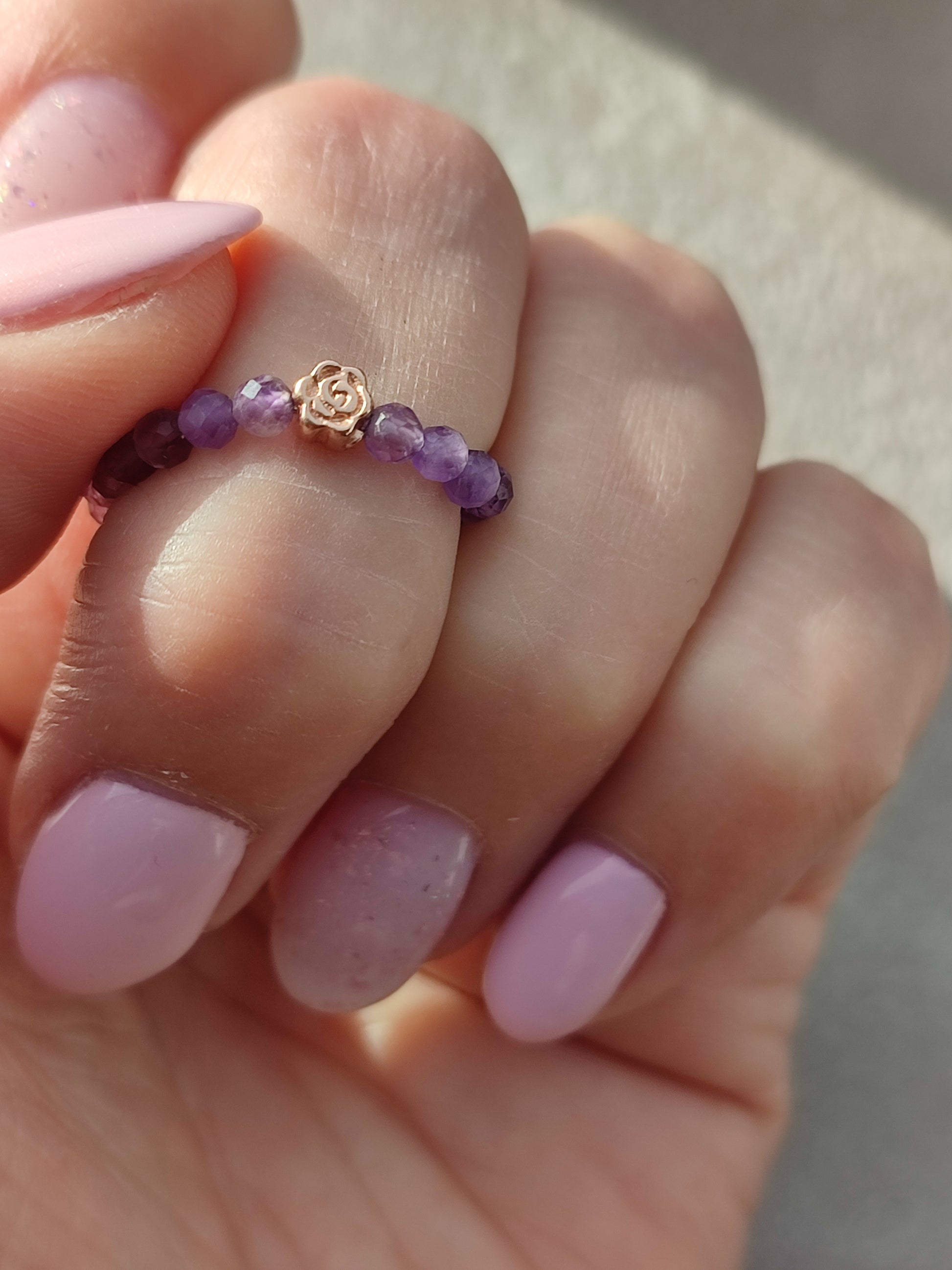 Tiefviolette Amethystperlen fangen das Licht auf zauberhafte Weise ein und verleihen jedem Look eine geheimnisvolle Note. Auf feines, elastisches Gummiband aufgezogen, schmiegt sich der Ring sanft an den Finger an . Die filigrane Rose- goldene Rose setzt einen edlen, femininen Akzent und macht dieses Schmuckstück zu etwas ganz Besonderem.
