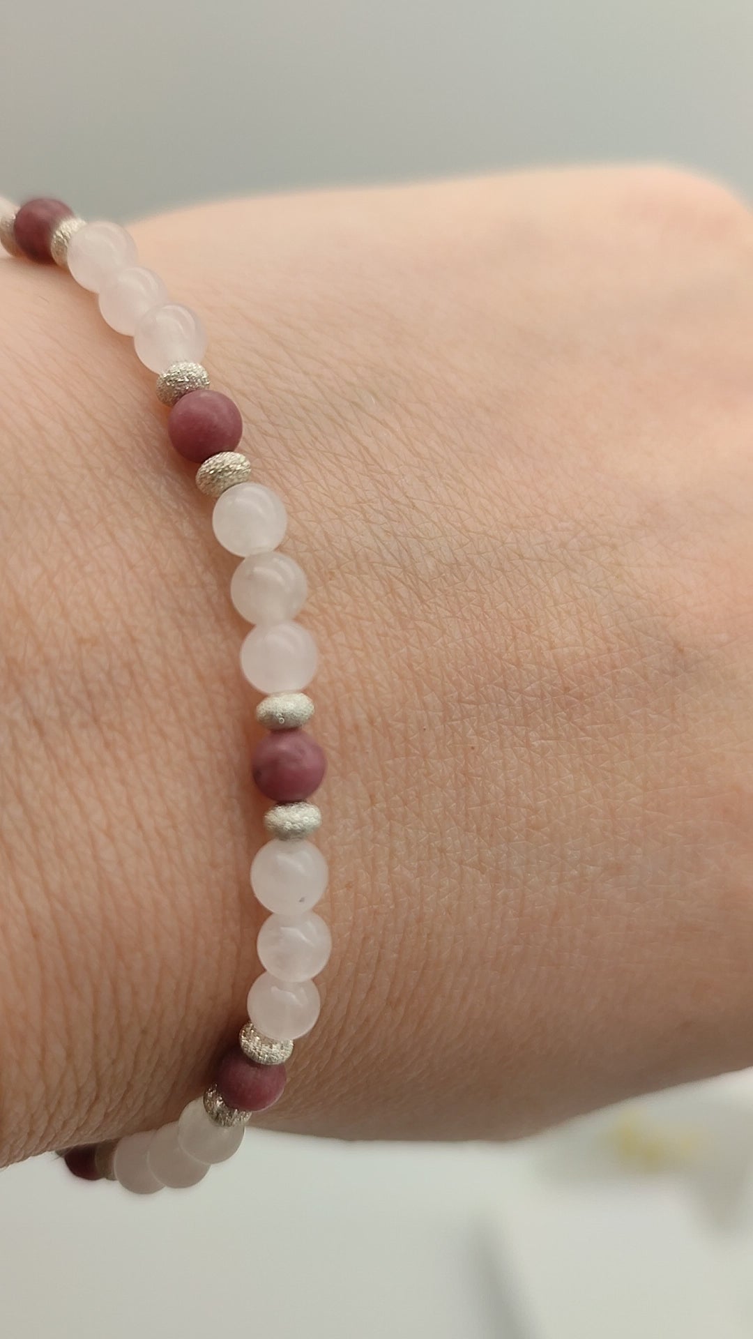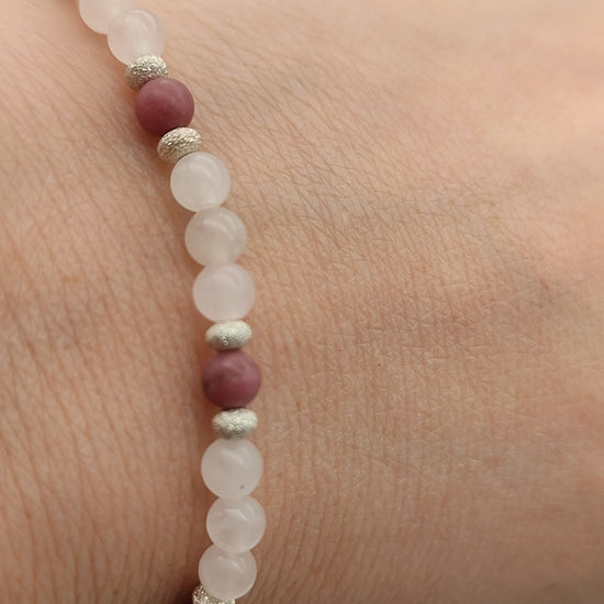 Dieses fein gearbeitete Armband vereint sanft schimmernden Rosenquarz mit erdenden Rhodonit-Perlen und funkelnden Silber-Elementen, die jedem Lichtspiel eine elegante Note verleihen.