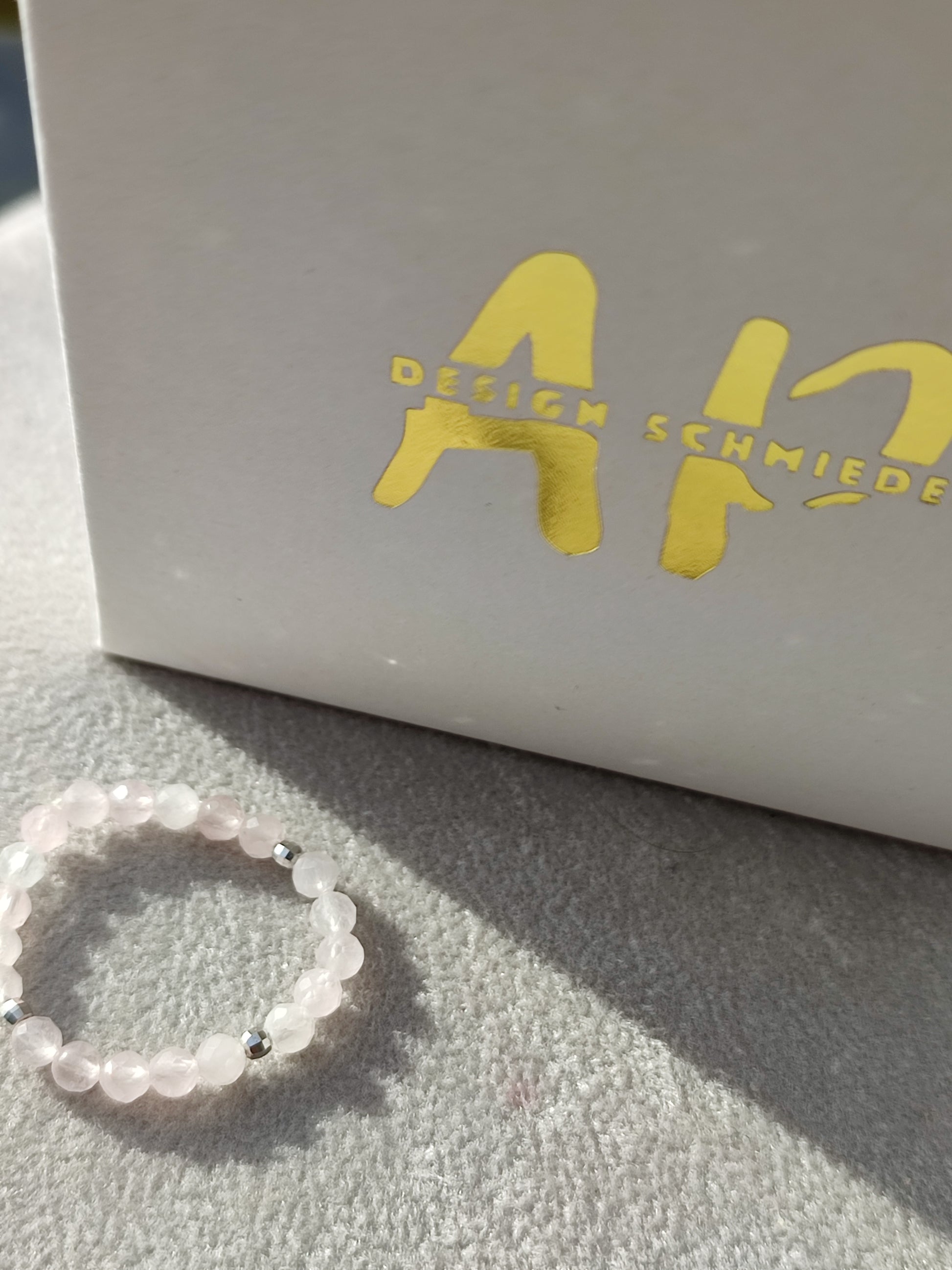 Zarter Rosenquarz in edlem Rosé trifft auf fein glänzende Silberelemente. Jeder Ring wird in liebevoller Handarbeit gefertigt – mit sorgfältig eingefassten Details und verdeckten Knoten für ein perfektes Finish.