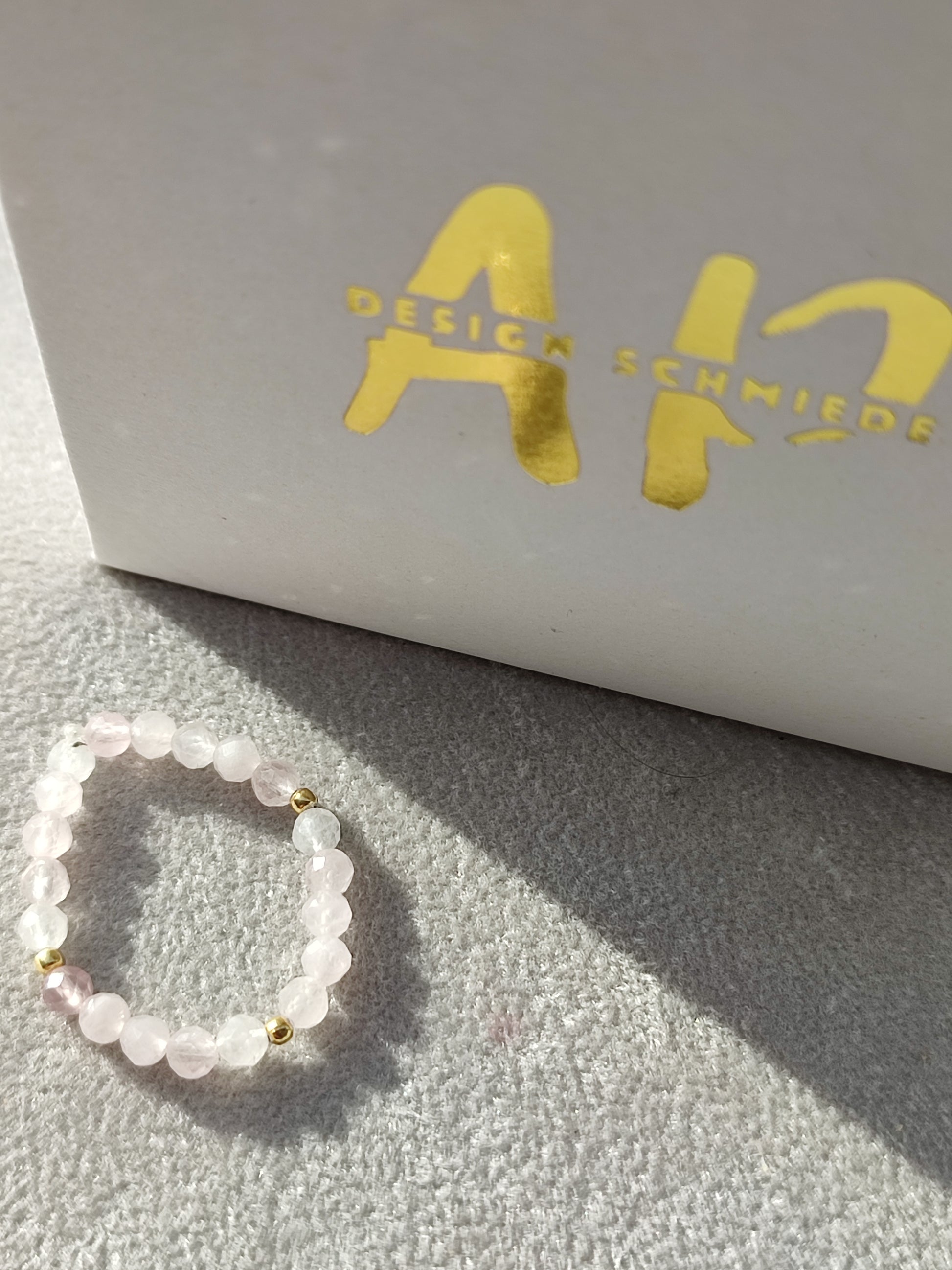 Sanft schimmernder Rosenquarz trifft auf warm glänzendes, vergoldetes Silber und entfaltet eine leise, feminine Ausstrahlung. Jeder Ring wird liebevoll von Hand gefertigt – mit feinem Blick für jedes Detail und einem Finish, das Leichtigkeit und Eleganz vereint.